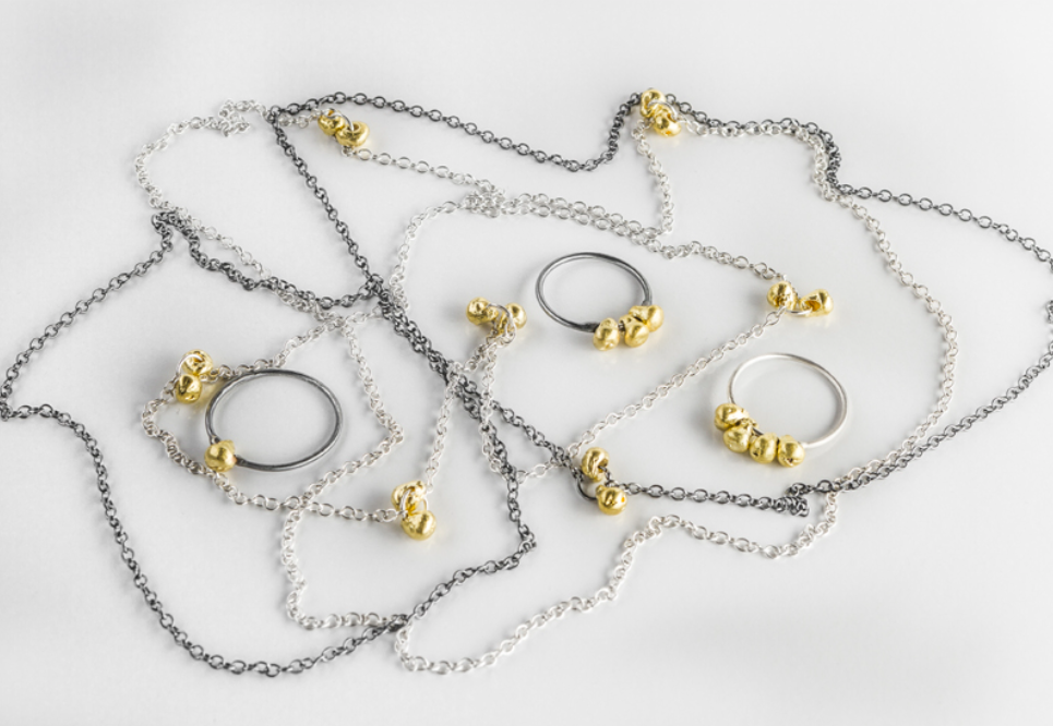 1 Gramm schwere Goldklümpchen werden gelocht und können je nach Wunsch in verschiedener Anzahl auf die Kette „gefädelt“ und befestigt werden.
