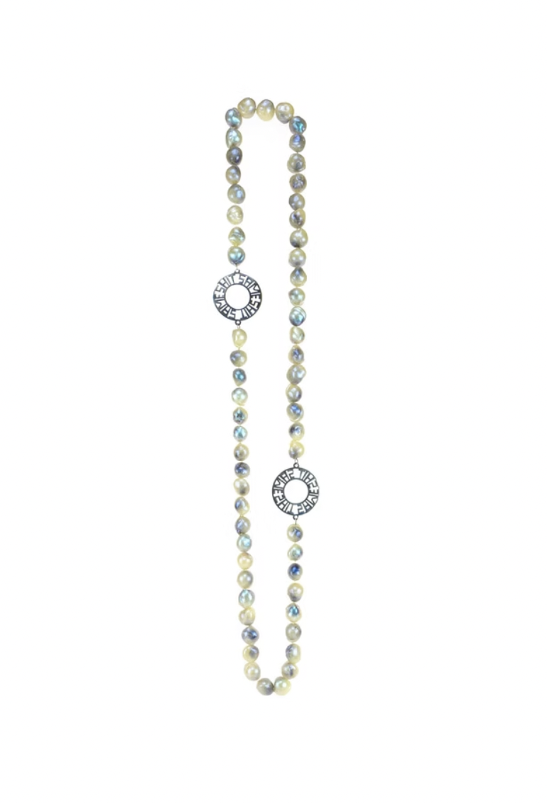 Für diese Kette wird Hasenkot mit Perlmutt überzogen.